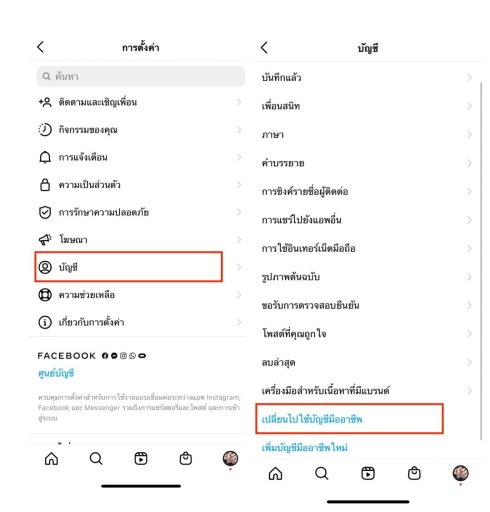 2. เลือก “บัญชีผู้ใช้” เเละเลือก “เปลี่ยนไปใช้บัญชีมืออาชีพ”